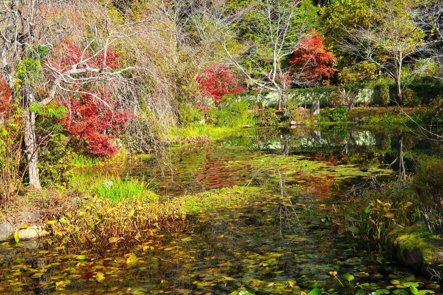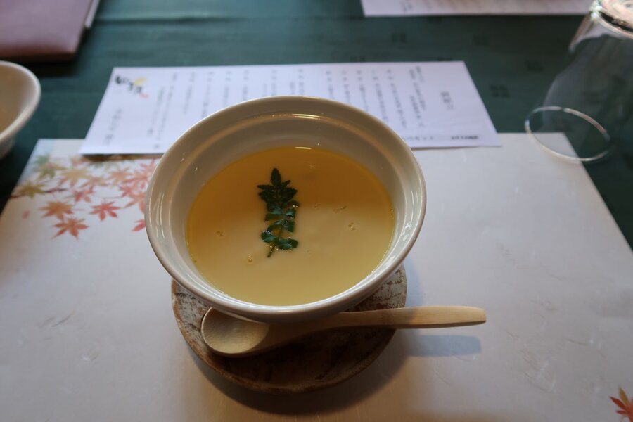 料亭 ゆう月は京都ガストロノミーアワード2023でグランプリを受賞した店。人里離れた隠れ家風のイメージ。池庭に面した席で、窓に広がる景色を眺めながら「季節の花御膳」を賞味する。食後は庭に降り立って里山の風景を楽しむことができるほか、無料の足湯サービスもある。ご参考までに当日の献立の内容は下記の通り。