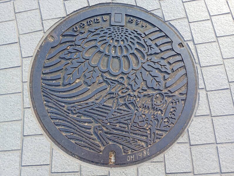 枚方は淀川とともに栄えてきた街で、枚方市のマンホールの蓋は、淀川を行き交う三十石船に食べ物を売る「くらわんか舟」と市の花である「菊」をデザインしている。