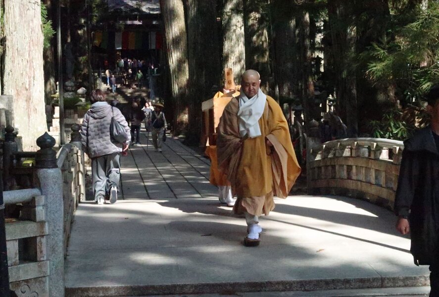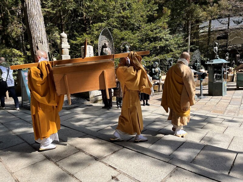 「維那(ゆいな)」と呼ばれる仕侍僧が先導し、2人の僧が下げ御膳を白木の箱に入れて担ぎ奥之院の御廟から御廟橋を渡っているところです。
