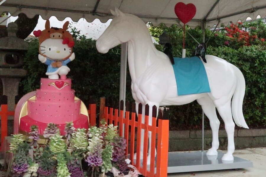 キティーのオブジ、鞍にはハート型のおみくじPRグッズらしきものが乗っている。